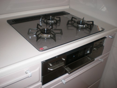 新しくなったシステムコンロです。コンロ右側に出来た30Cmのスペースがとっても便利!!